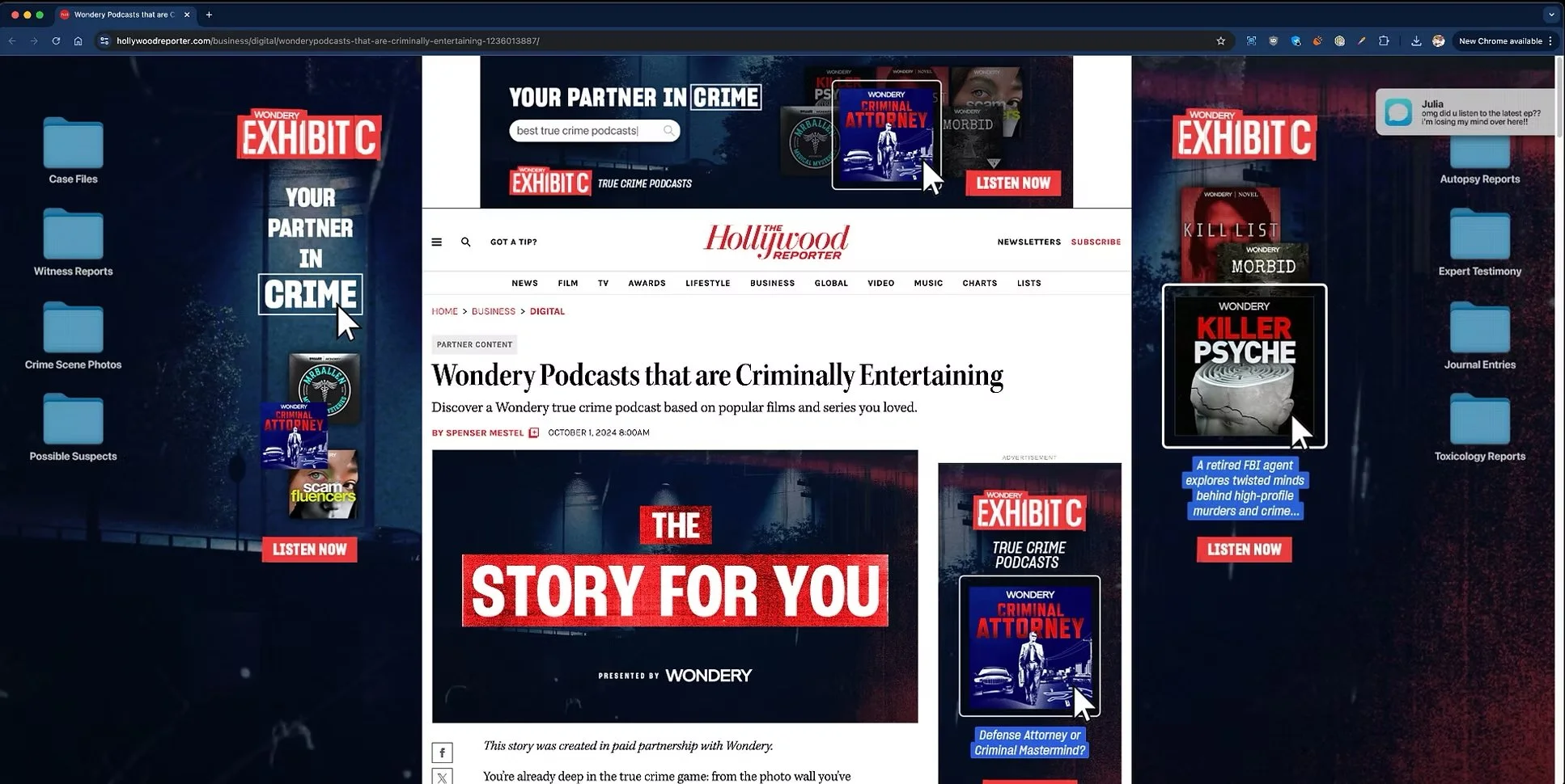 Wondery is an award-winning podcast network with tons of high-quality content, and Exhibit C is Wondery’s collection of true crime podcasts. “Your Partner in Crime” celebrates the armchair investigators of the true crime community while inviting newcomers to join us on a trip down the rabbit hole of these real-life stories. The campaign extended across social, digital, out-of-home, and a Hollywood Reporter takeover. One Wondery exec called it “the best we’ve ever done.”